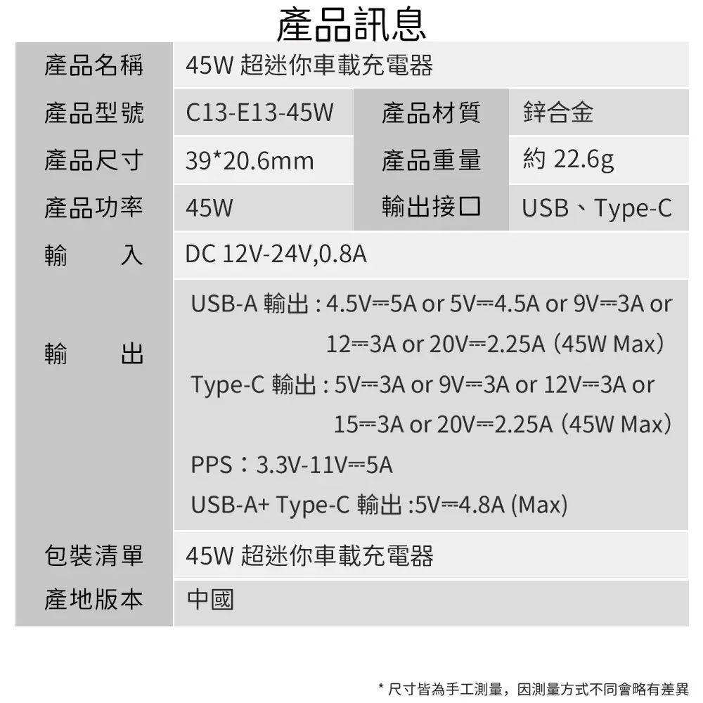 產品名稱:45W迷你車載充電器 產品型號:C13-E13-45W 產品尺寸:39*20.6mm 產品重量:約22.6g 產品功率:45W 輸出接口:USB、Type-C 產品材質:鋅合金 BSMI字號:R3E606 包裝內容:45W迷你車載充電器*1 重量 0.1 公斤 尺寸 7 × 3 × 10 公分